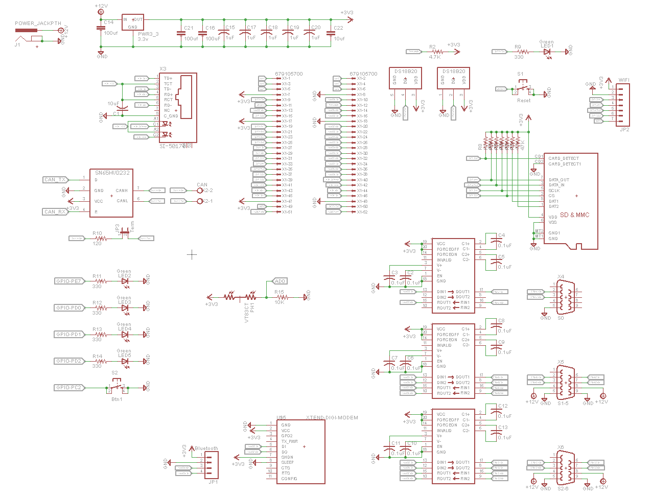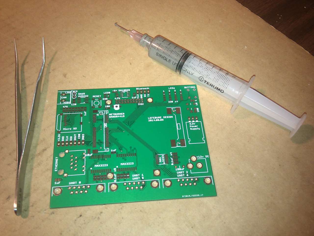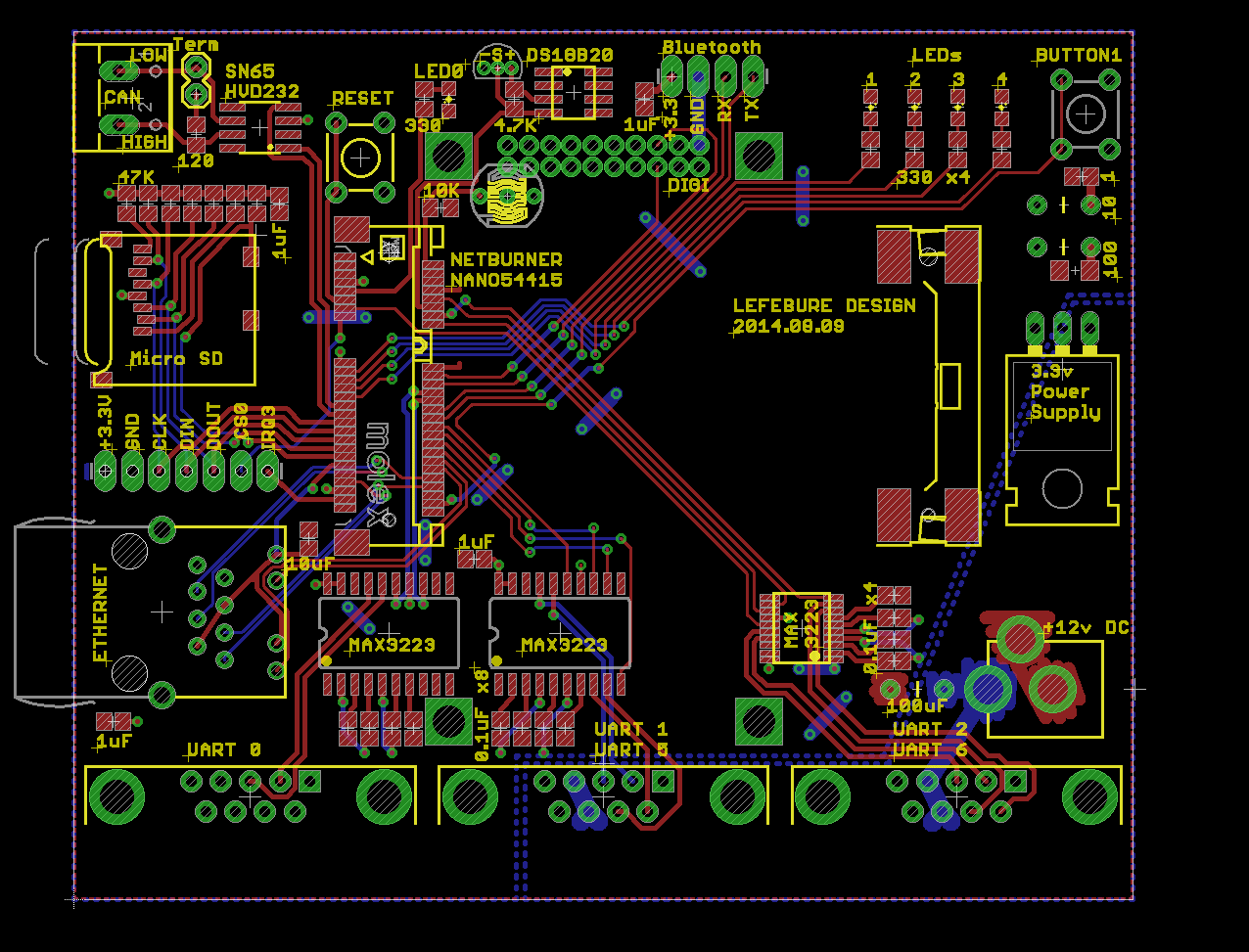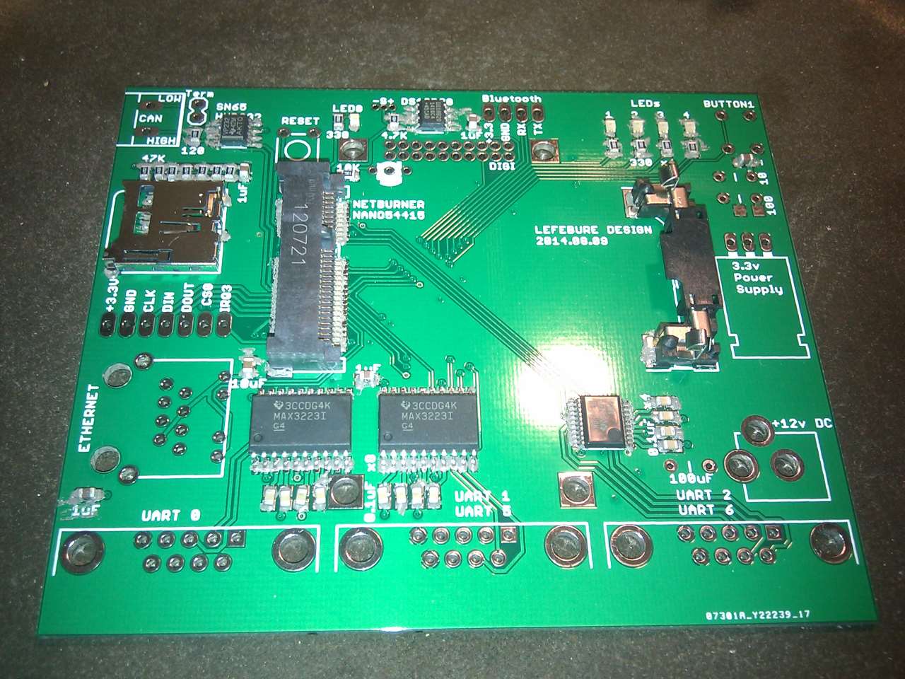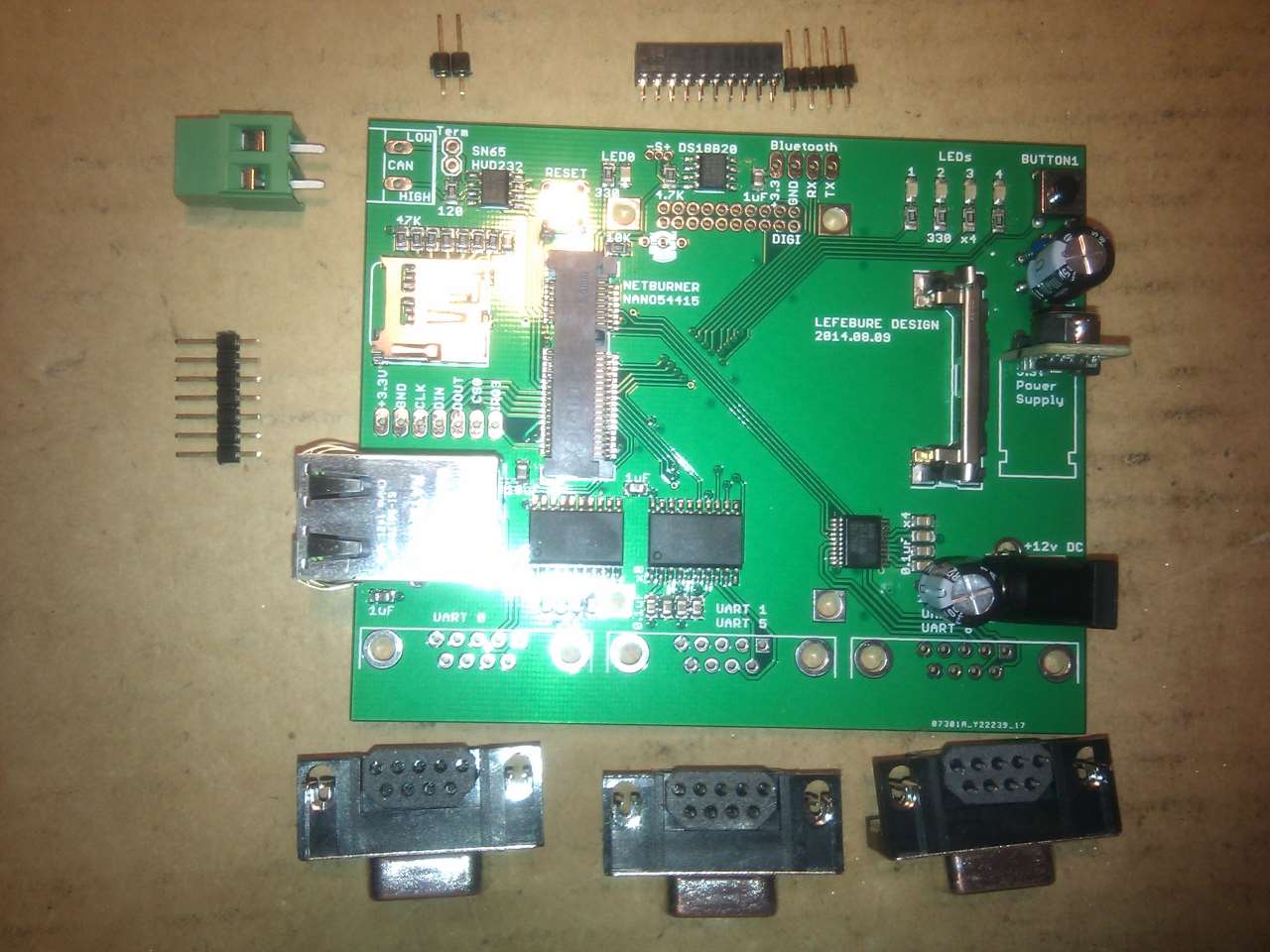 The main processor module, a Netburner NANO54415, will go in the center of the board. The other things around the outside include (clockwise from the 12:00 position):