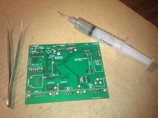 This board has some surface-mount components on it, which means I'll be using solder paste. This is a gray gel that is made up of tiny balls of solder. You put the gel on the pads, the components stick to the gel, then you heat the whole thing up and the solder melts like normal solder. The syringe of solder paste and an angled tweezers to place the parts. I'm doing this by hand, but anything mass produced would have this step done with a robot. They're much faster and consistently accurate.