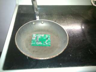 The board carefully goes into a thick skillet and that goes on the stove top. Turn the stove on and watch the solder melt. Timing is critical here, as it cannot get too hot or the parts will break, and it needs to cool slowly. When it's done cooking, I leave it in the skillet to cool. The heat from the pan will slow the rate of cooling. In case you're curious, no, I don't cook food in this skillet. This is used for circuit boards only.