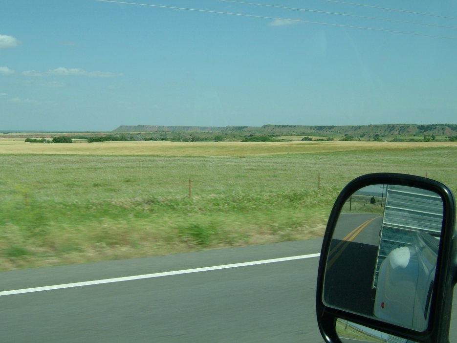 We completed our trip to Frederick at just over 1000 miles. We had a small delay when one truck ran low on fuel and wouldn't purge the air from the fuel system. We had strong head winds today to fight against too. Kansas has some irrigated ground, but only saw 2 of them running the whole day, if that gives you an idea of the moisture in the area. We saw taller wheat that was green in the morning. About 50 miles from OK, the color changes to brown, and then finally in southern OK the wheat is that awesome golden color. As we came into Frederick, there was only 1 crew already cutting wheat. This is my first time into OK and I must say that this state is awesome. The scenery of the hills is incredible.