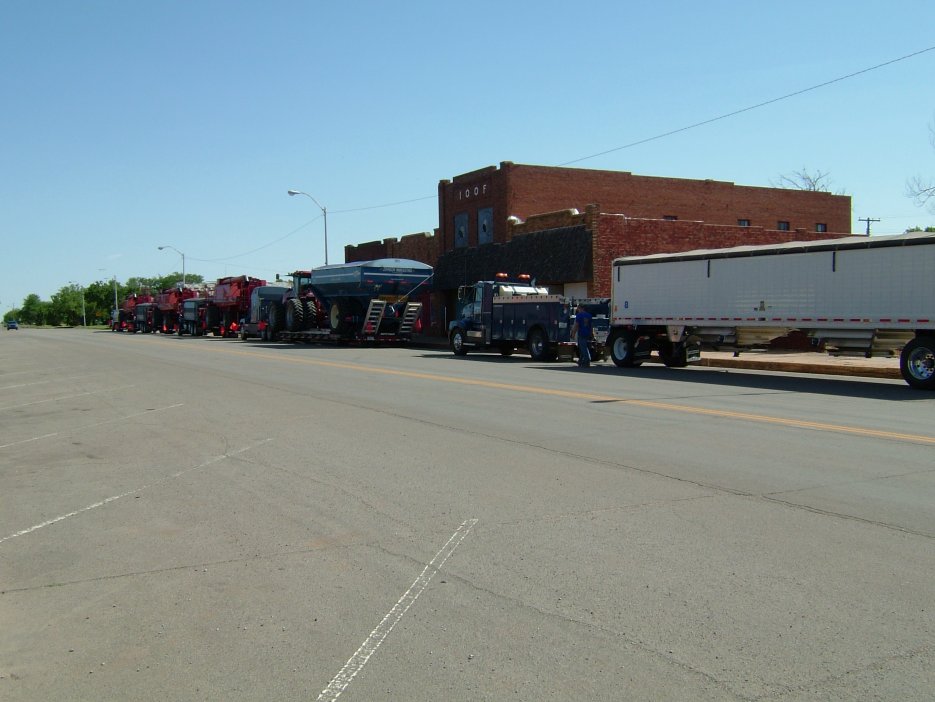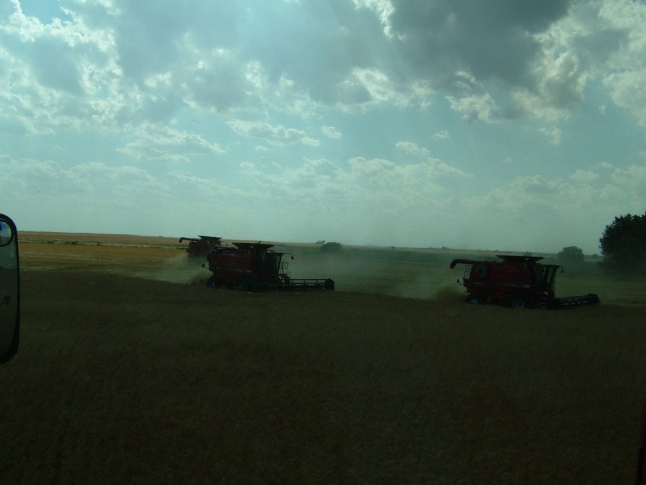 Yesterday it rained some more, so we went down to Enid for the afternoon. I got to check my e-mail for the second time since I started. Then we went down to Fairview to get a belt for combine #8 and then back to Nash. Someone arranged another trip to Enid for supper and a movie with the ladies from the elevator in Nash, so back to Enid we go. Today it has been about 75 degrees with sun and wind. It might be possible to cut again tomorrow afternoon, but the logistics of trucking becomes and issue as the fields are all soggy. We had about 70 acres left of a 160 we picked up as some extra work to do, but we are going to leave it and go north. I brought 3 machines back to the pasture where we will load them onto trucks yet tonight. My machine #2 has cut a total of 1549 acres and has just over 100 hours on the rotor.