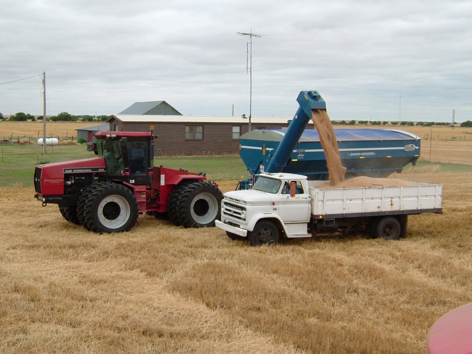 It rained early this morning and we slept in till almost noon. After breakfast, or rather lunch, we went to Enid to get food and check out the huge grain elevator. The big one is supposedly the second largest inland elevator in the world. It has a capacity of 28 million bushels. Each wing is about 900 feet long. They have bicycles on the roof for the employees to use when they are checking bins. Storage is mostly wheat, but a little milo, corn, and some other crops. They can dump over 1000 trucks in a day and then do rail at night. Tomorrow we will probably resume cutting with a team of 5 machines. We should have about 2 days of cutting yet here in Nash.
