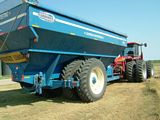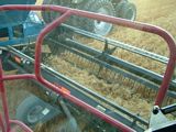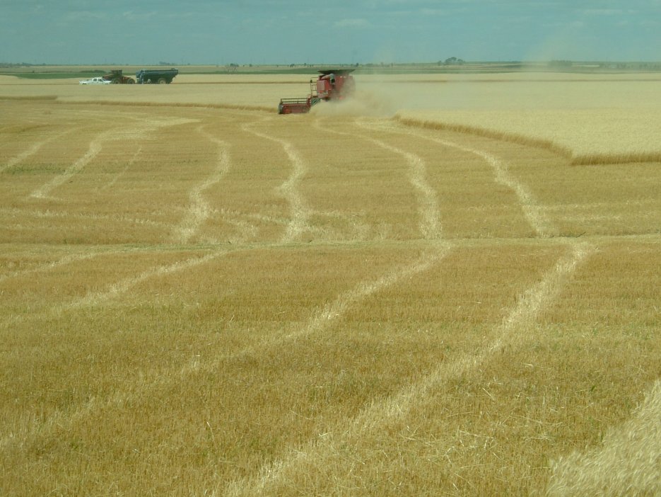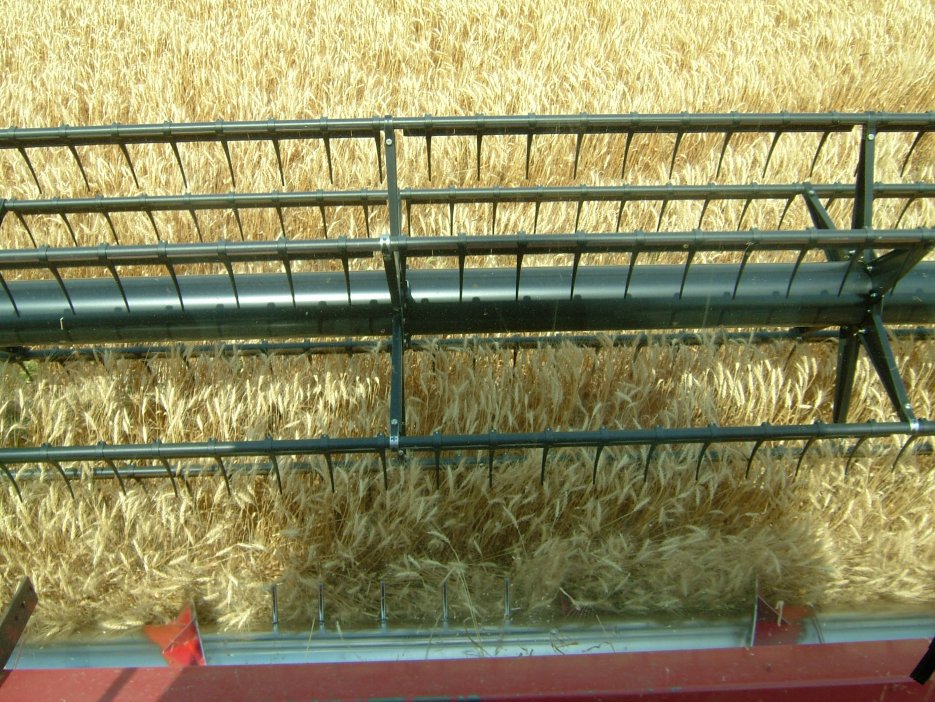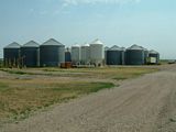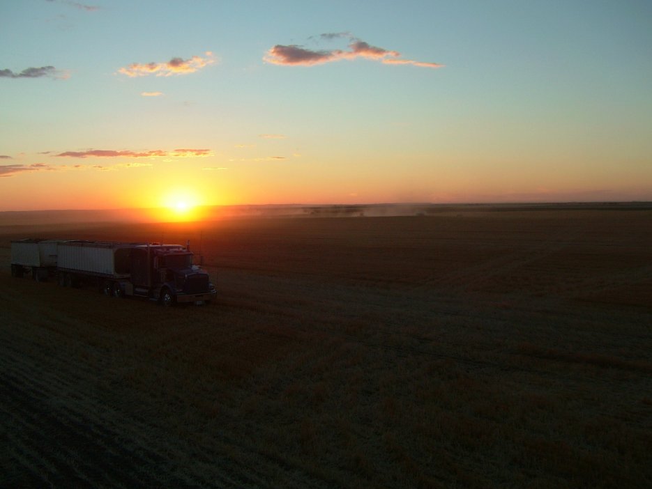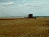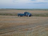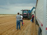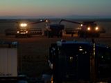We're back at the trailers. We started cutting after lunch and cut till just after dark. I don't have a clue how many acres we covered, but it has to be well over 500. Combine #5 sprung a hydraulic leak by the transmission. That got fixed, but started to leak again about the time we finished up. My machine and one other got plugged up air intake filters which caused a lot of annoyance from the idiot lights and alarms. All of the spring wheat cut today was hauled to the bins, which are maybe a quarter mile away. The temperature today was only about 80 degrees which was very nice. It is actually on the cool side tonight. We fought with a brisk breeze most of the day today as well, but that slowed tonight about dusk, making it a crazy mess of combine lights as we finished the field. Just think of an airport in the fog with planes still landing.