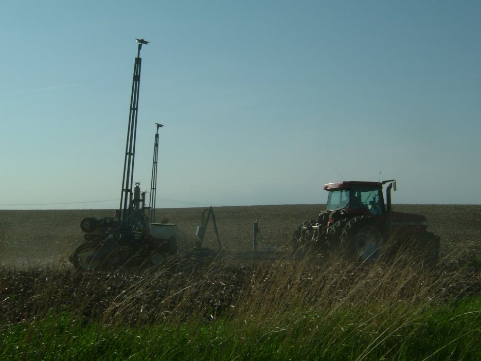 Today marks the end of the planting season for us. The soybeans are done. The planter will be going right into the shed, since nothing should need to be replanted this season. Temperatures are expected to be into the 90s by the end of this week, which should really get the crops growing. The highlight of the past few days was a flat tire on the planter tractor. We noticed it two days ago, it won't hold air for more than a hour, and the sidewall is already shot. The tread was pretty worn down too, so we just ignored it and kept on planting. Today it finally came off the bead, but it's still on the rim. It does look a little awkward though. If we had more mud, it would have been a problem.