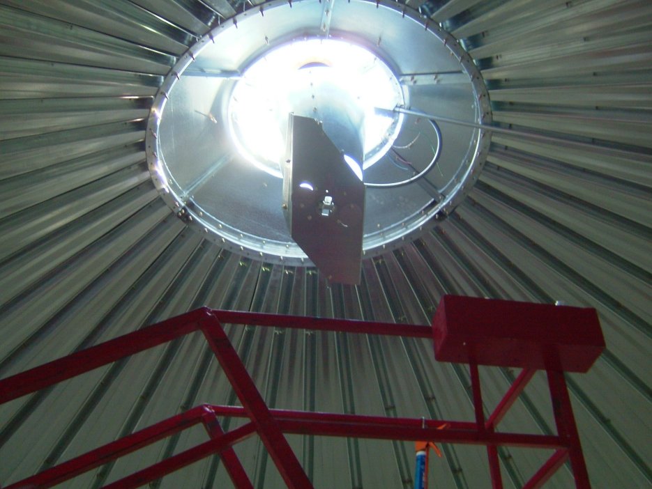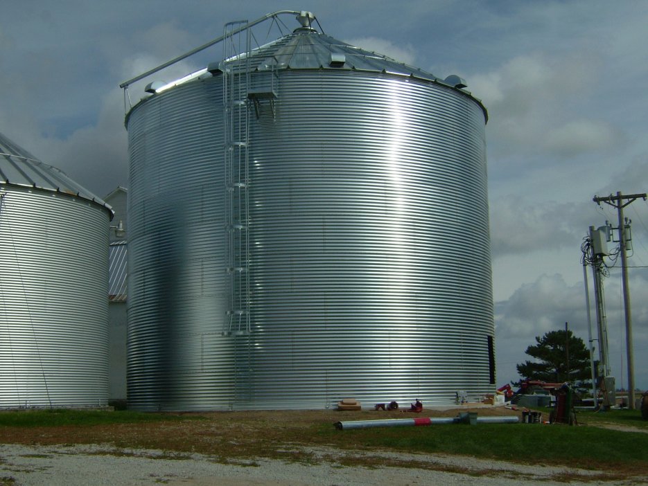 We installed the grain spreader and the cyclone for the air system. All the roof bolts got tightened. After we lifted the bin and put the second ring on, we took the stairs out. The pattern is to lift the bin with hydraulic bin jacks, bolt the next ring on, tighten all the bolts with impact wrenches, set the bin back down, unhook the bin jacks, hook the bin jacks one ring lower, then lift again. We put all the rings on the bin today. I figure this is the modern day equivalent of a barn raising party. In the old days, all the pieces for a barn were cut while on the ground, probably over several weeks or months. Then they would bring in all the family, friends, and neighbors, and they would put the entire barn together in one day.