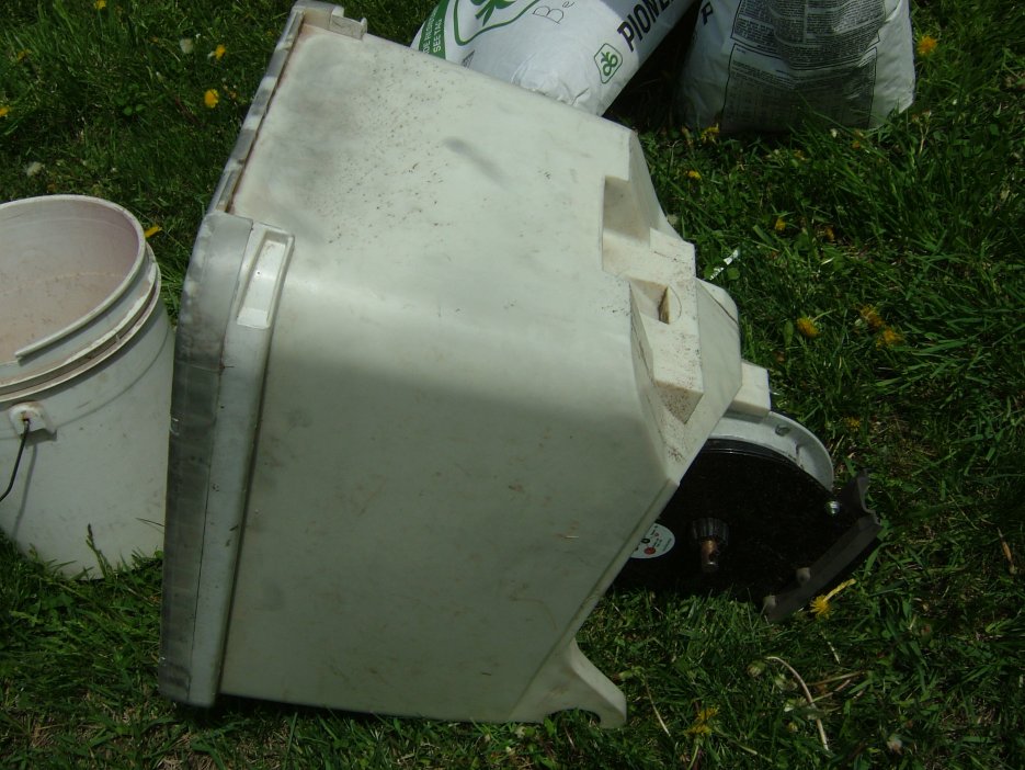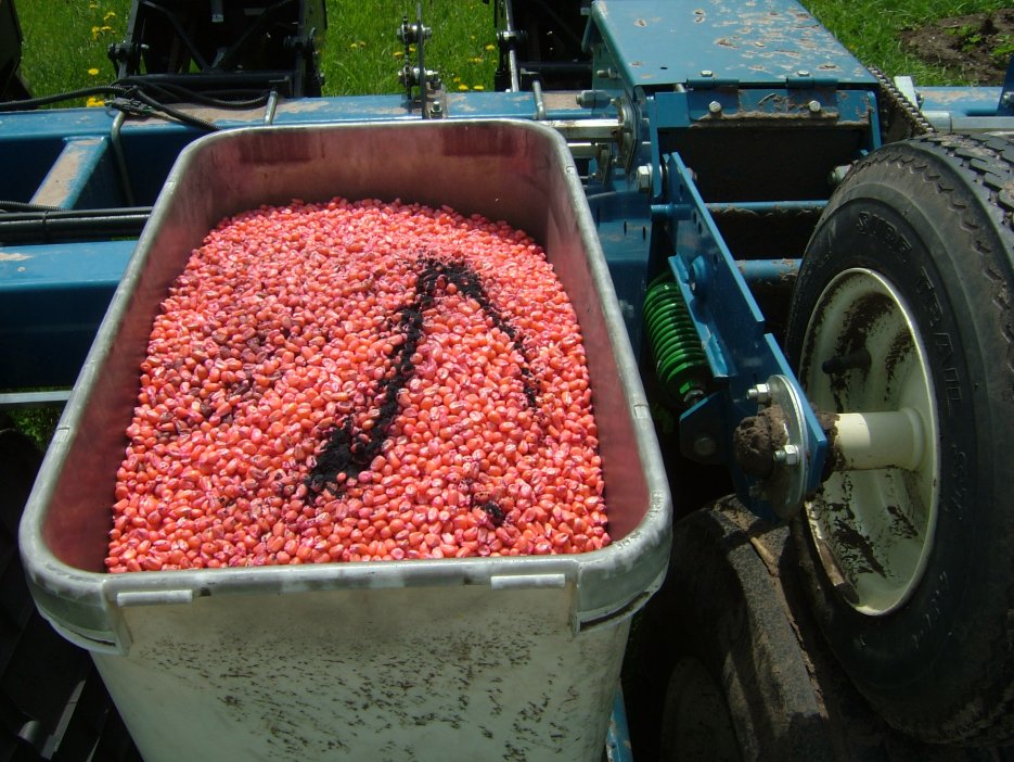 We got back into the fields this afternoon. The pictures here are from emptying out the seed that was in the hoppers, so that the next field we go to is completely a different hybrid. We take the white hoppers off and dump them out, which is the first 4 pictures. The next 3 pictures show us putting seed into the hoppers. What we do is place the bags on top of the hoppers, then slice them open with a knife and shake the last few kernels out. That is why you see folded bags in a few of the hoppers. After that, we add some graphite (the black stuff) to the seed for lubrication of the pickup fingers that accurately meter the kernels when they get dropped into the ground. Put the lids back on and we're ready to go again.