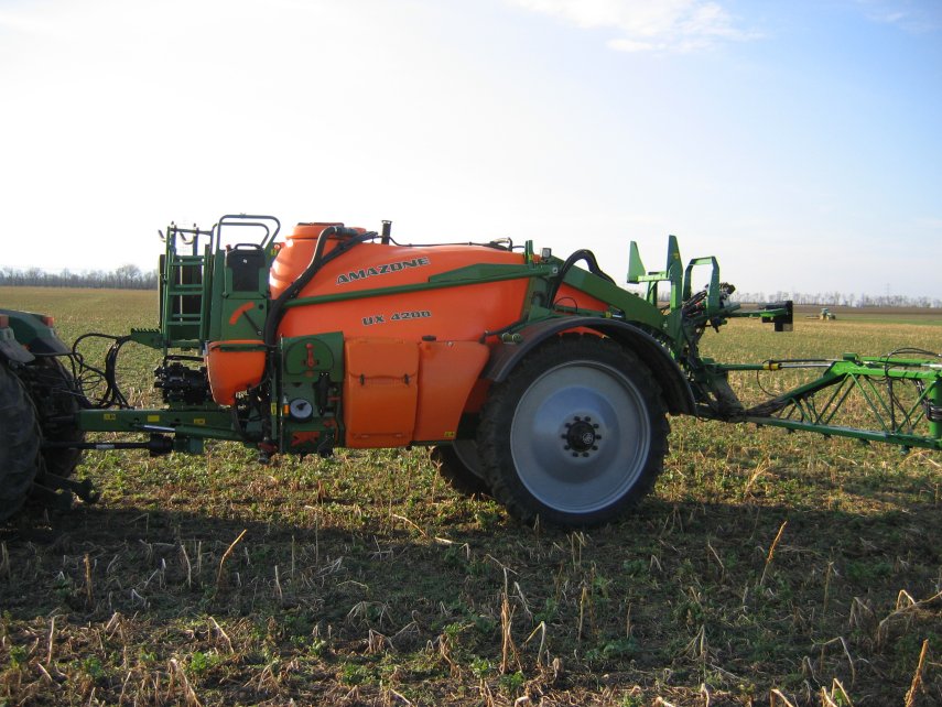 We've been spraying burndown on all the green fields to prepare for spring durum, peas, sunflowers, and beets. We got a new sprayer from Amazone with a 72 foot boom and 1200 gallon tank. It can be pulled by any tractor over 115 HP with a 540 RPM PTO. We’re very satisfied with it so far.