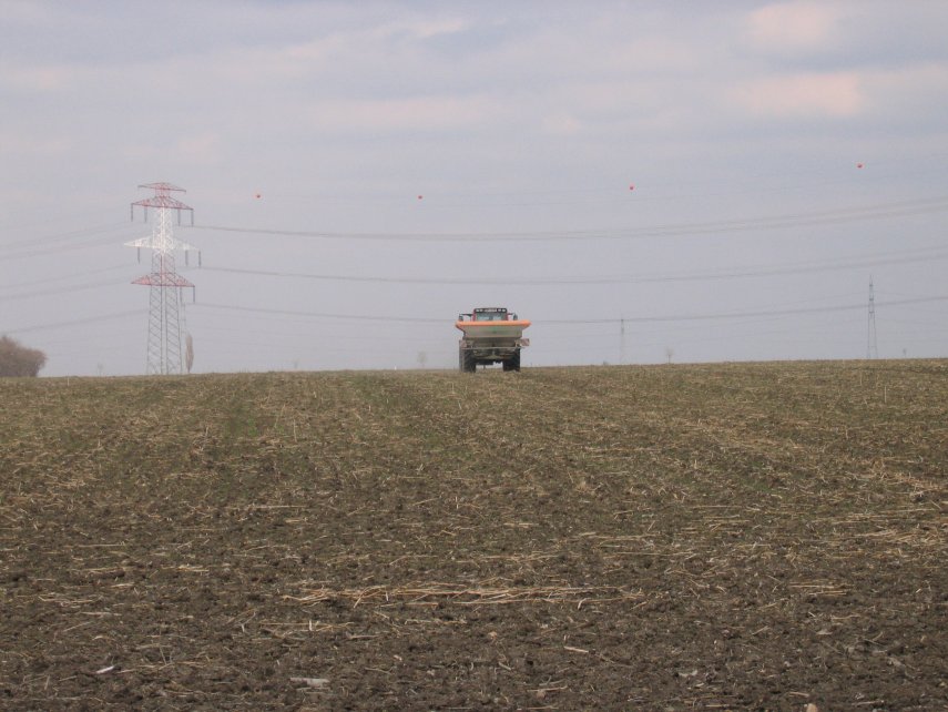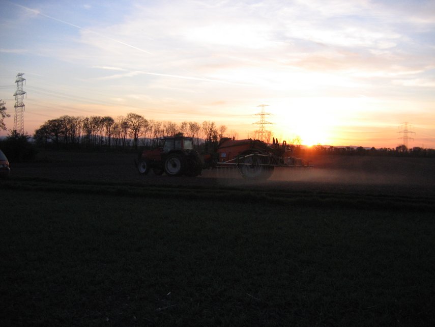 Fertilizing (Nitrogen and PK) on all fields including the winter wheat and barley. We still hope that it rains in the near future to make all the fertilizer available to the plants. We use a spreader that has a scale in it. It weights every 25 kg the fertilizer back and compares the weight then with the spreading computer. So it is possible to use cheap, low quality fertilizer without problems. It is independent on the speed you‘re driving - it will do a good job up to 15mph. Notice the trailer that can be lifted up with some extra hydraulic cylinders to fill the spreader without an auger.