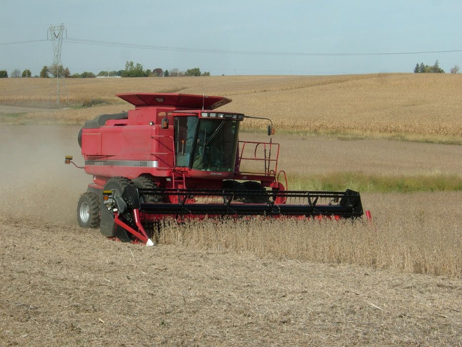 We are now cutting soybeans that are dry, but the stems are still green, and it is taking a lot of power to thresh them. For extra fun, they are wrapping on the reel. One machine ate a 6" chuck of steel this morning, and the other blew out the weld on the feeder reverser cylinder.
