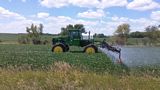 The bugs are still eating at the soybeans, so the sprayer is out fixing that problem. Meanwhile, we're working on the electrical part of the grain site project. This big wire is the main feed in, and is not much fun to wrestle with.