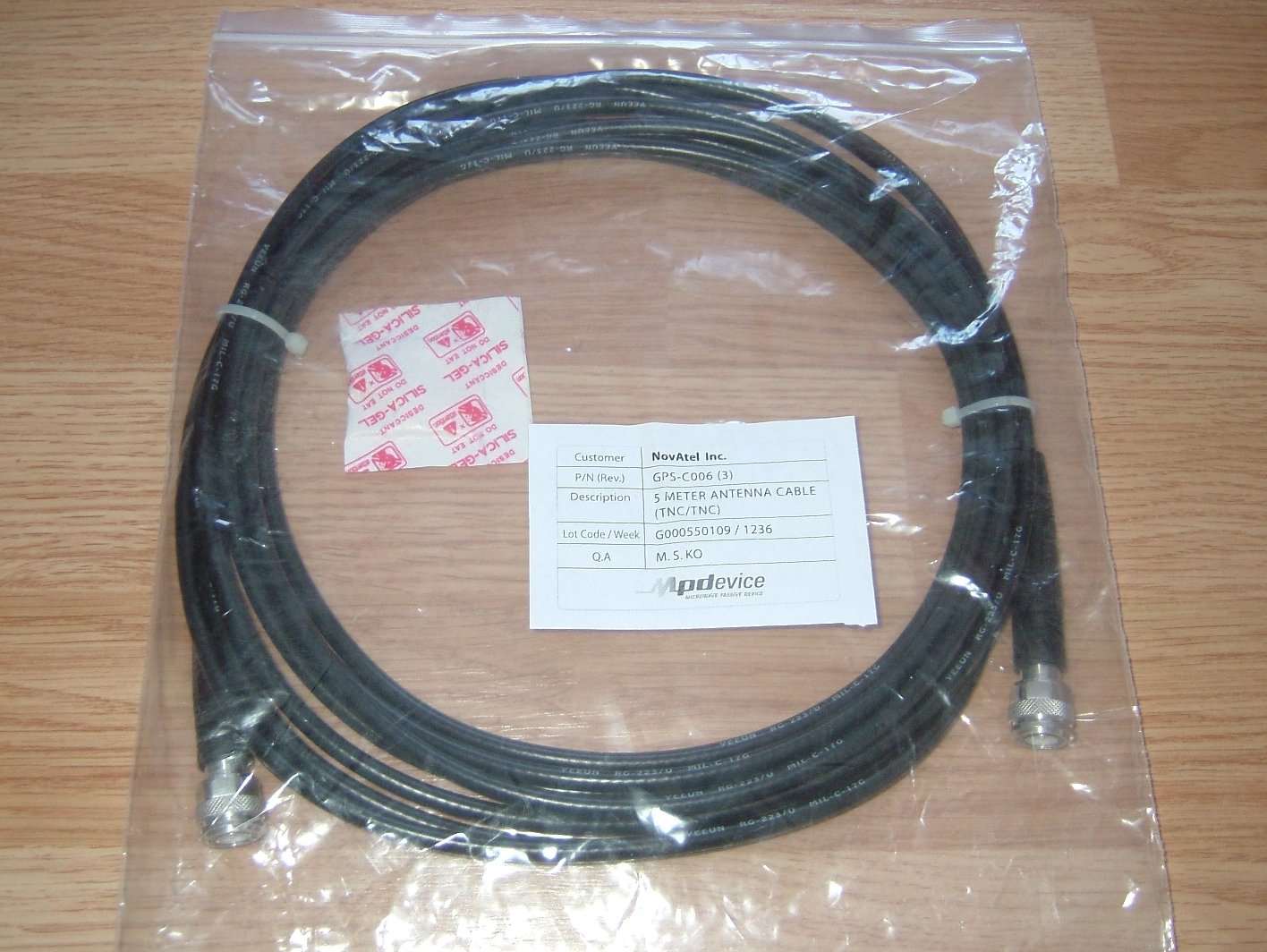 The GPS-C006 antenna cable is designed for connecting an antenna to a NovAtel ProPak, FlexPak-G2, or FlexPak6 receiver. It is 5 meters (~15 feet) long, made from MIL-C-17G RG223/U coax, and has straight TNC male plug connectors.