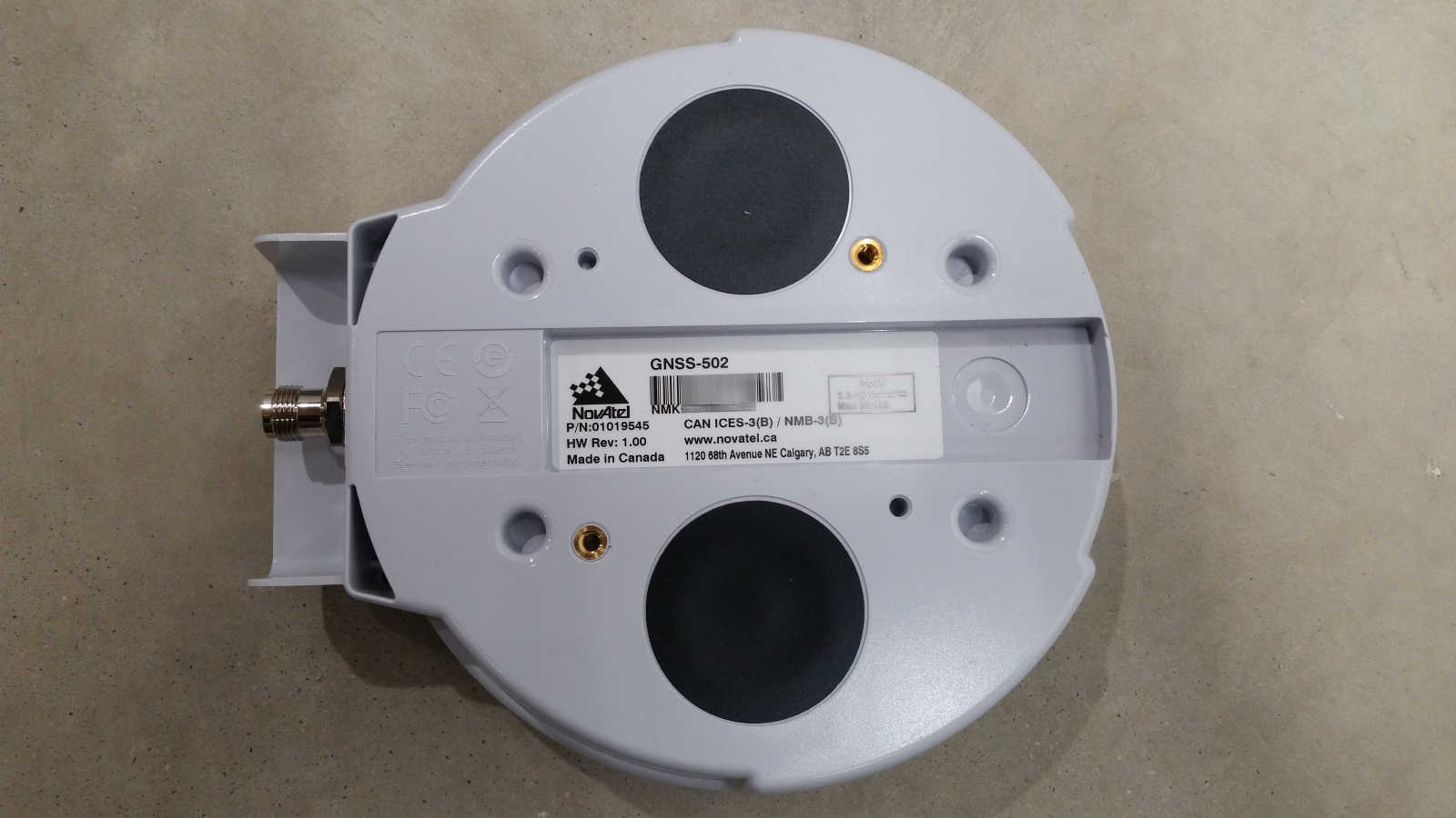 The GNSS-502 is a high-performance low-profile GNSS antenna. It is commonly used with NovAtel PwrPak7 receivers, and can be used for RTK base or rover operations. It has a female TNC connector and four threaded holes for mounting. It is durable and light weight, so it can be used for permanent outdoor installations or mounted to a vehicle. For most agricultural users, this is our default receiver.