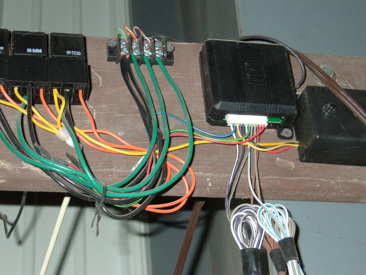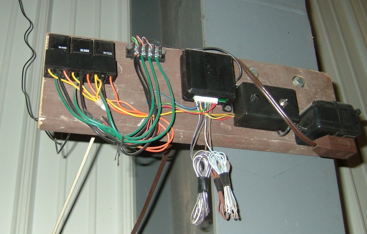 The third image shows the 3 relays, a screw terminal block, the DEI 450R, a box for the programming button and ignition switch, and a 12v DC power supply. This is all mounted to a 1x6 piece of wood, bolted to the side of the building.