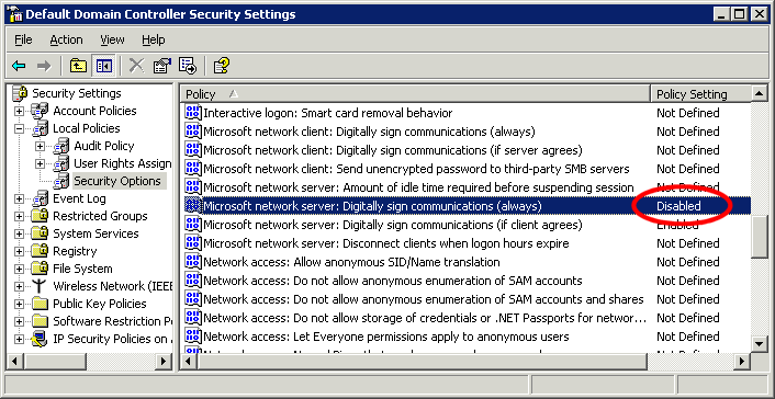 If this is a domain controller, you will have to disable the message signing requirement. You'll find this in the default Domain Controller Security Policy: