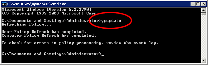 If you did the above step for domain controllers, drop to a command line and run "GPUPDATE" to refresh the policies in effect. When that completes, reboot to be sure they take effect: