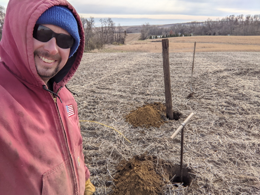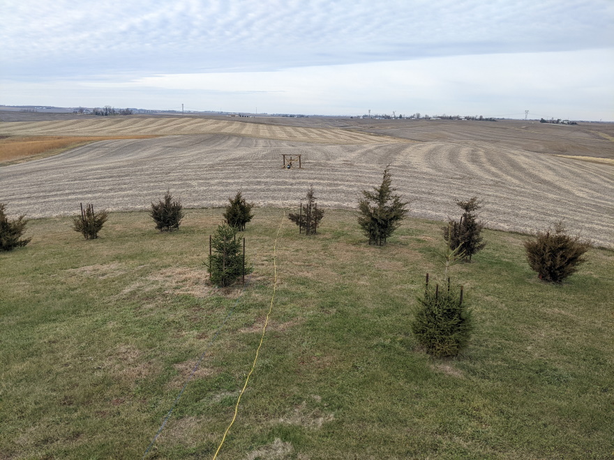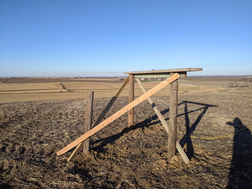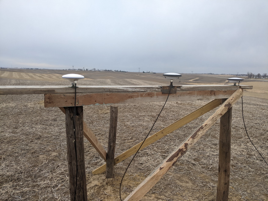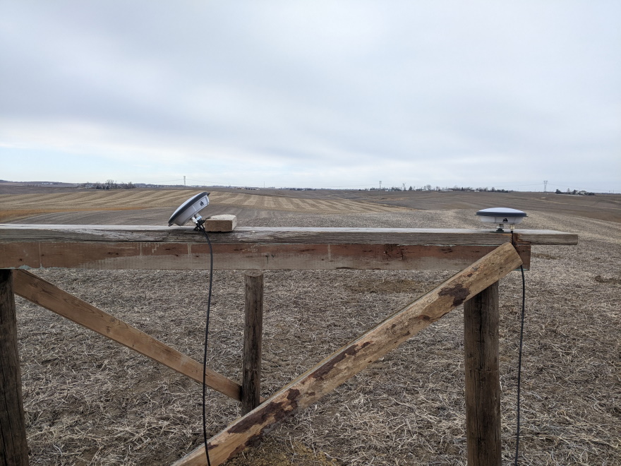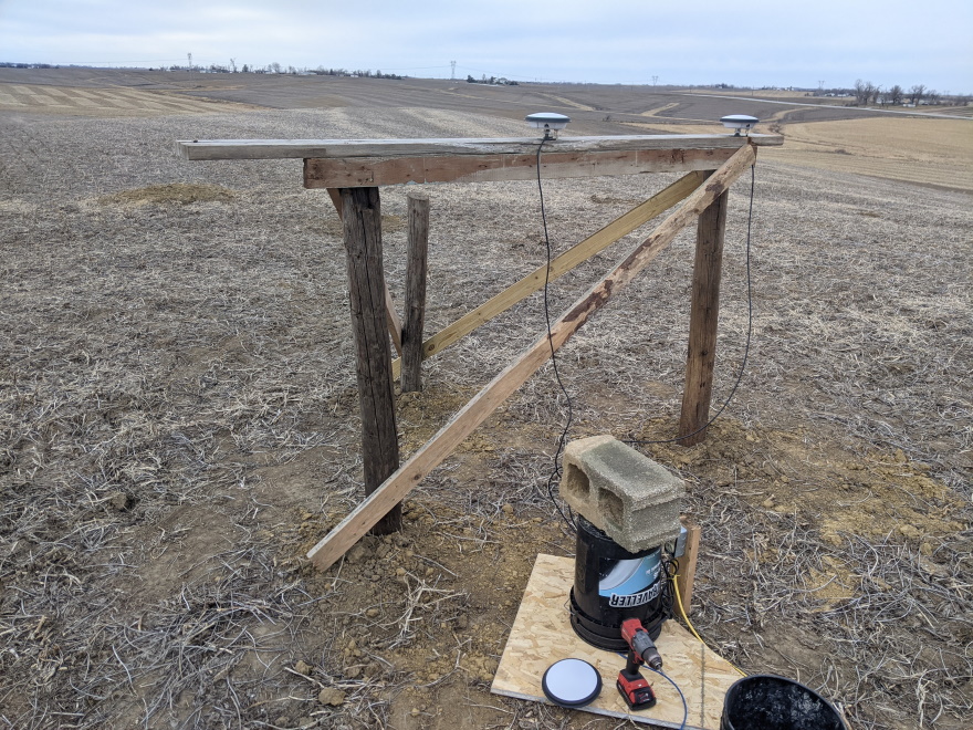 The location I selected for testing is 250 feet from my house, on the ridge line of a hill, with fantastic visibility of the sky in all directions. It is one of the highest elevations in the area. The ground here had been planted to soybeans this year, so no deep grass to deal with. I dug holes 3+ feet deep and placed three wooden posts in a triangle approximately 6 feet on each side. Dimensional lumber was added on top of two of the posts, onto which I mounted the GNSS antennas. The third post was only used as a knee-brace for the others to increase rigidity. I pulled power and Ethernet to this location. For all my testing involving NovAtel PwrPak7 receivers, I used a POE switch and POE to 12v DC power adapters to power the receivers. Data was all fed back to a computer for logging via the Ethernet interface.